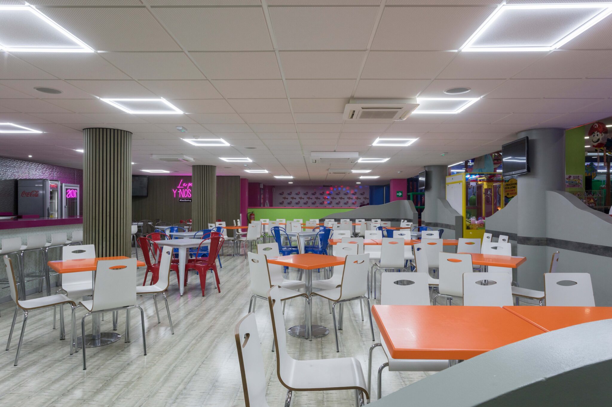 Disponemos de 200m² de cafetería donde podrás tomar lo que quieras mientras que tus hijos juegan. Café, refresco, cerveza… algo dulce, una tostada…