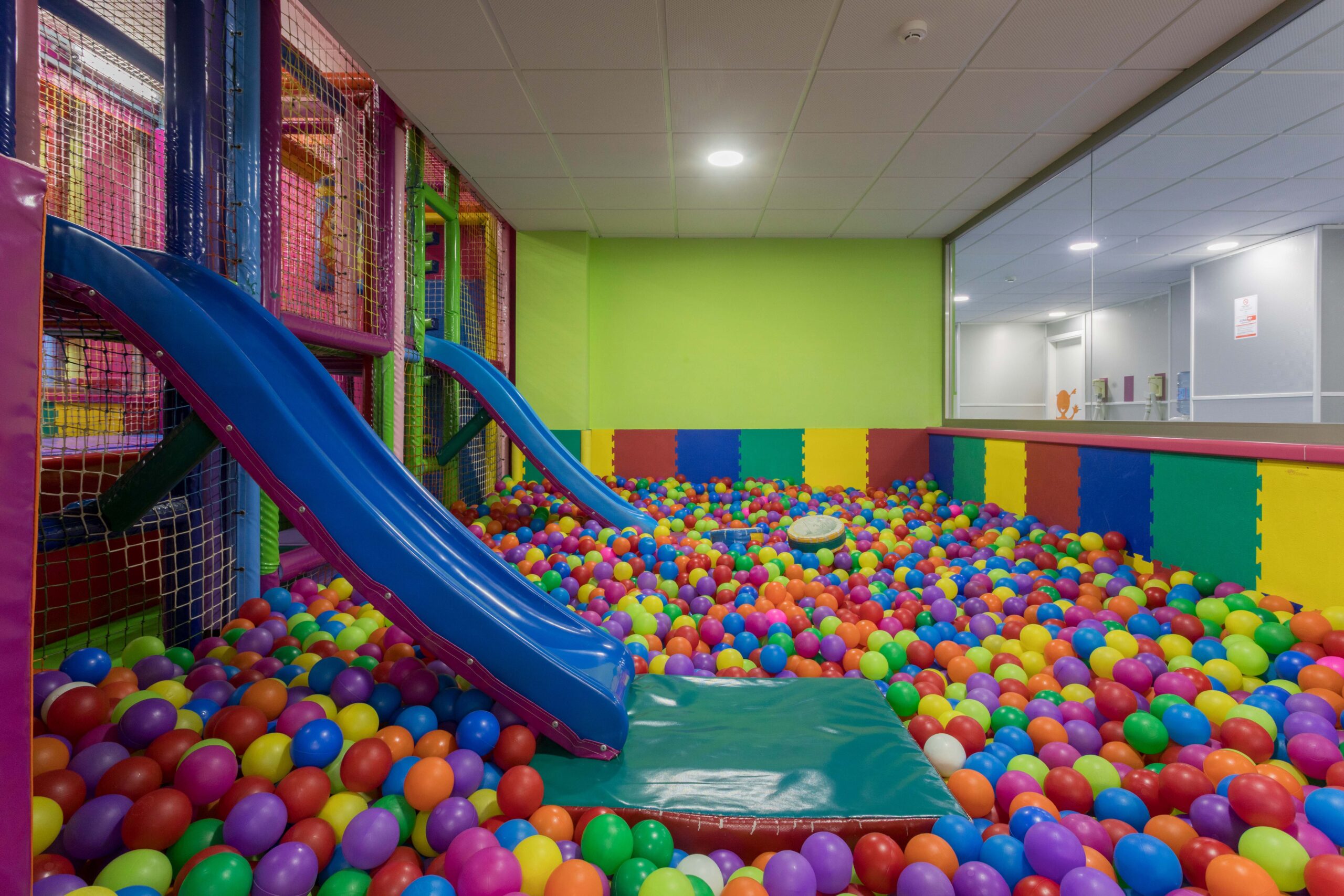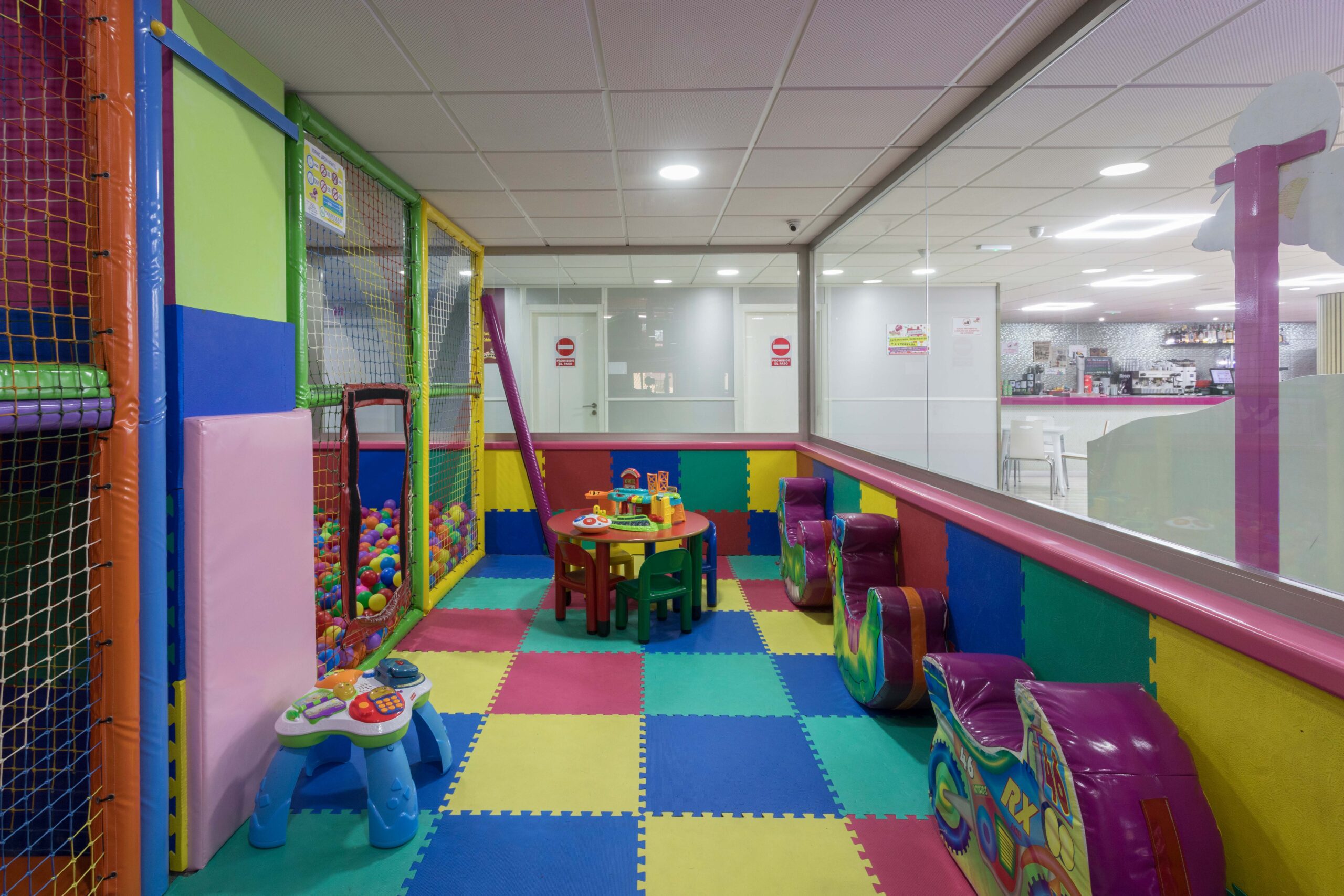 Este recinto está acristalado, con lo que podrás ver lo que hace tu pequeño en todo momento. La zona está siempre cerrada, así que podrás tomar un café tranquilo en nuestra cafetería ¡y si te necesitamos, te avisamos! Si tu niño necesita adaptación, podrás pasar con él/ella sin problema.